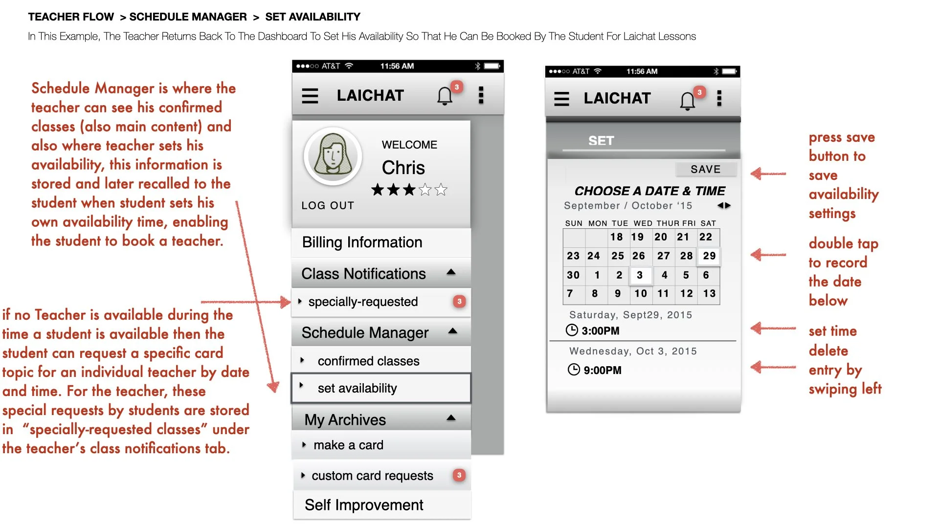 Students and teachers are able to schedule availability with one another in an advanced scheduling and are also able to schedule “Online” or “Live” video conferences on-demand. Below is documentation on how a teacher schedules his time on the mobile app. At the start of a new week, the weekly schedule is wiped clean and the teachers must re-enter their Schedule. The Teacher’s availability is parsed into the student pool in order for the teacher to be booked. The scheduler looks much like a calendar where one sets a date and a time.