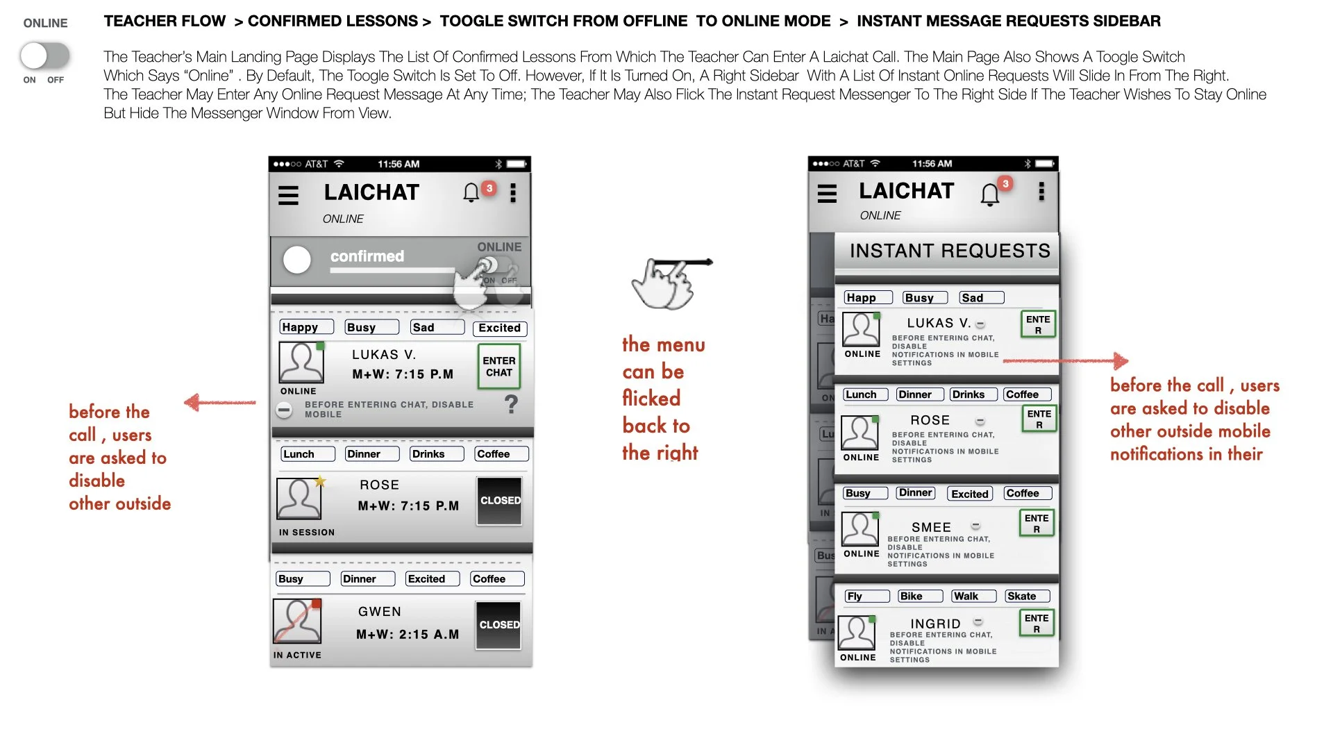To receive An Online Request, a teacher has to be switched to the “on” mode in the Online Toggle. Now, the Online classes are indicated within the online left sidebar which would slide in from the right of the screen. Each request would indicate: interested Student + Name, The Student Mini Card List, Class Length, & The teacher’s Option to Either Accept or Decline this new Class.